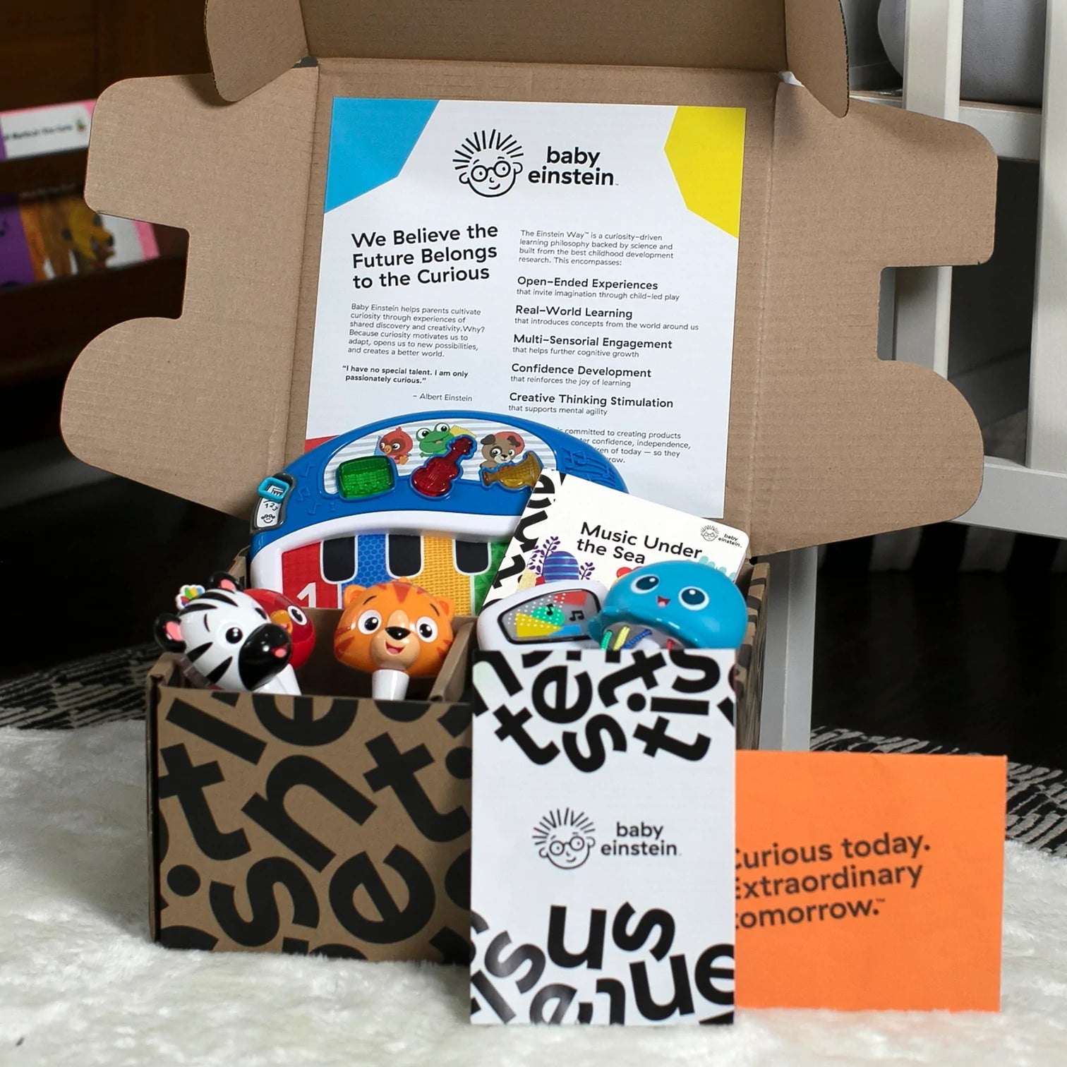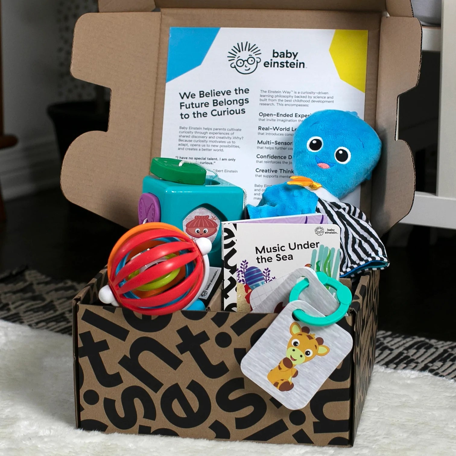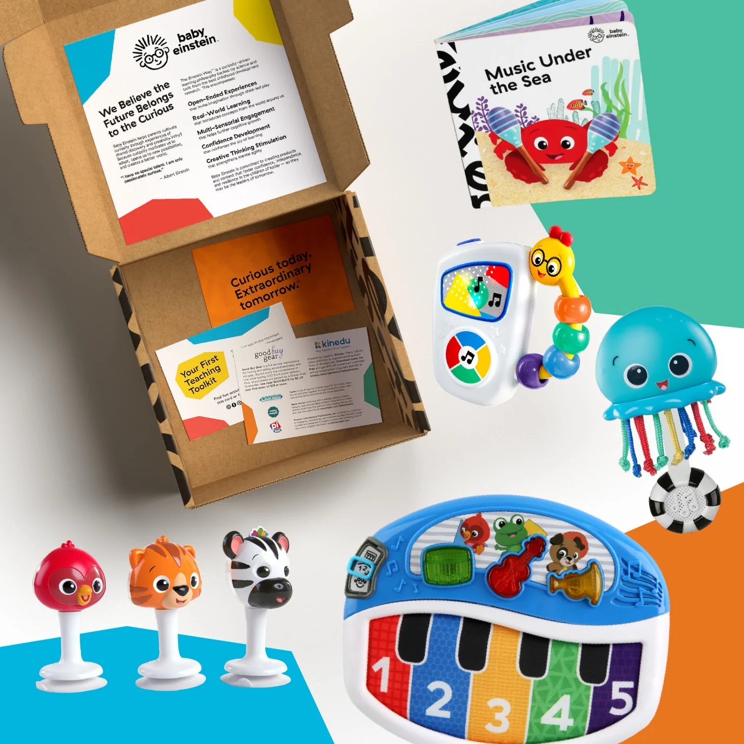 Inclui 8 peças: 4 brinquedos sensoriais e de descoberta de formas; um livro cartonado; atividades DIY para download; detalhes para streaming de música Baby Einstein no Spotify e vídeos de entretenimento educativo no YouTube; e ofertas exclusivas para Kinedu e Good Buy Gear