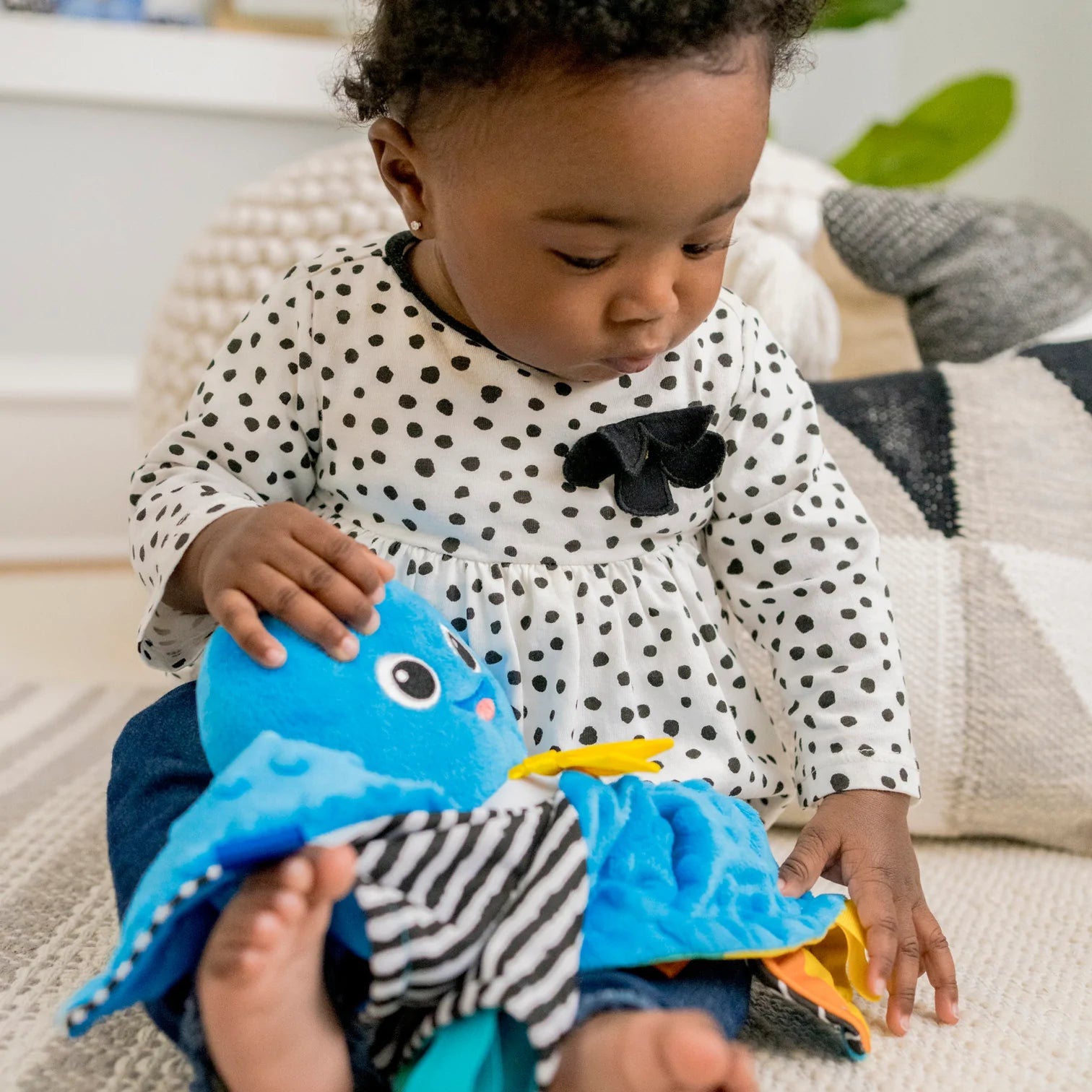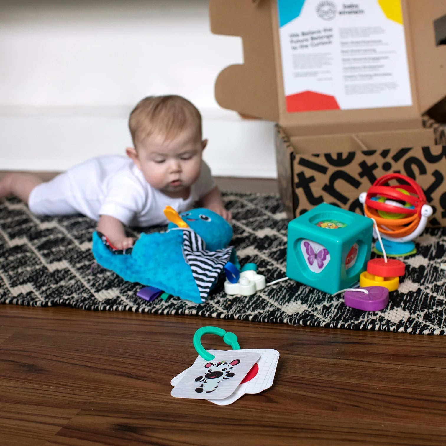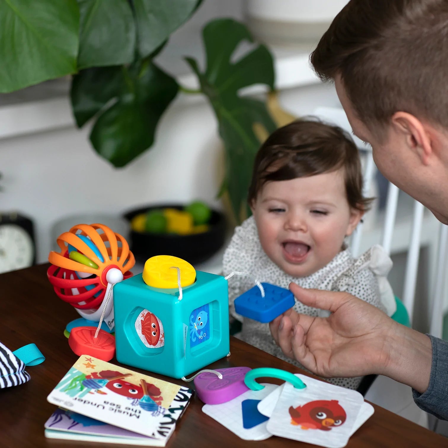 Uma coleção selecionada de brinquedos que convidam a brincadeiras abertas e multissensoriais — de imagens e sons interessantes a texturas que seu filho adora tocar; desperta a curiosidade do bebê sobre formas e promove habilidades de correspondência com um classificador de formas